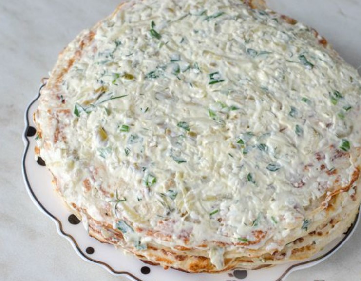 We also grease the last cake with the filling. Decorate the pancake cake with chopped dill and cranberries.