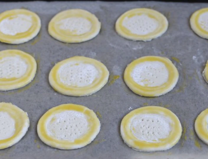 We layout the blanks for tartlets on a baking sheet with parchment. Lubricate the edges of the tartlets with yolk and send them to bake in an oven preheated to 180 degrees.