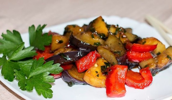 I suggest a hearty appetizer or a hot salad of eggplant, potatoes, and peppers, in a sweet and sour Chinese sauce – chisanchi. It is easy and quick to prepare.