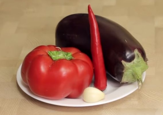 Prepare eggplant, bell pepper, hot pepper, garlic.