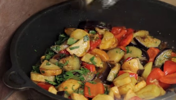 When the eggplants are ready, put the potatoes and peppers in the pan with them. Heating can be reduced.
