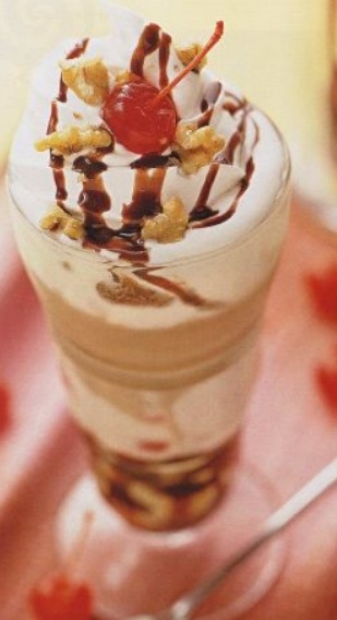 - Whisk the milk and vanilla ice cream in a blender. Pour the ice cream in glasses with this mixture, top with whipped cream.