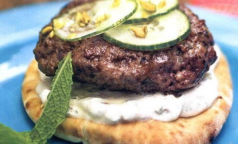 Ground lamb is grilled and served with pita bread and a light, simple sauce of yogurt, cucumber, and pistachio.