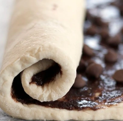 Melt the butter, add brown sugar and cinnamon to it, brush the dough with the prepared mixture and sprinkle with chocolate chips