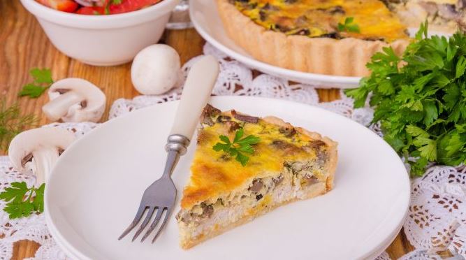 Serve the quiche with chicken and mushrooms warm or cooled. It is best to complement the quiche with a fresh vegetable salad.