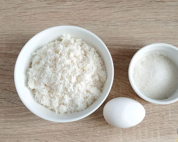 Combine coconut flakes, sugar, and egg white in a saucepan or saucepan. Vanilla extract can also be added if desired.
