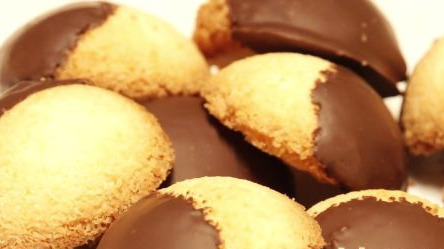Remove the finished coconut cookies from the oven and cool. You can glaze the cookies with chocolate half or all. To do this, melt the chocolate in a water bath or in a microwave oven, dip the cookies in chocolate, put them on baking paper, and let the chocolate harden.