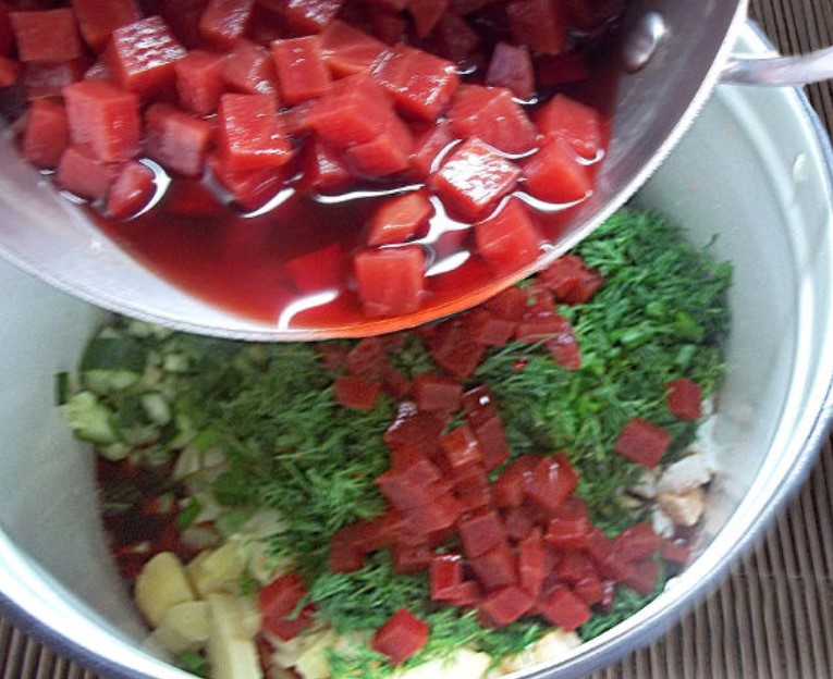 Put all the prepared foods in a saucepan of suitable size (approximately 5.5 liters), and add the boiled beets along with the beet broth.
