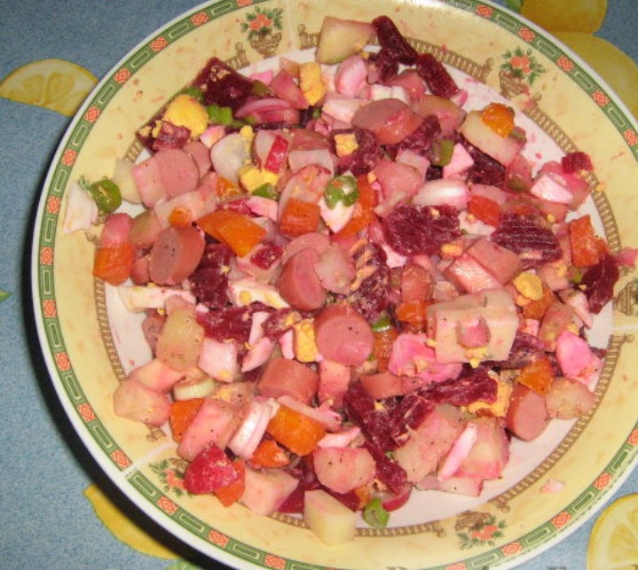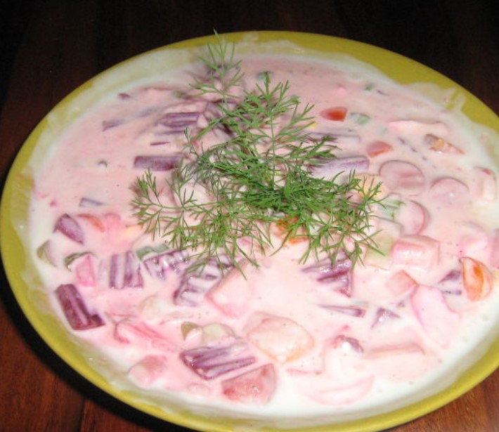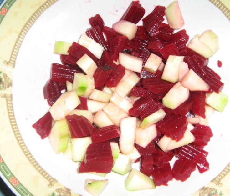 - Cut the boiled beets and fresh cucumber into small cubes. Drizzle lightly with vinegar and let stand while chopping the rest of the food.