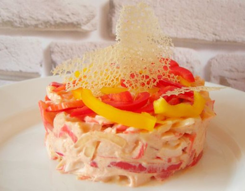 Decorate the salad with chopped peppers and cooked chips, imitating coral.