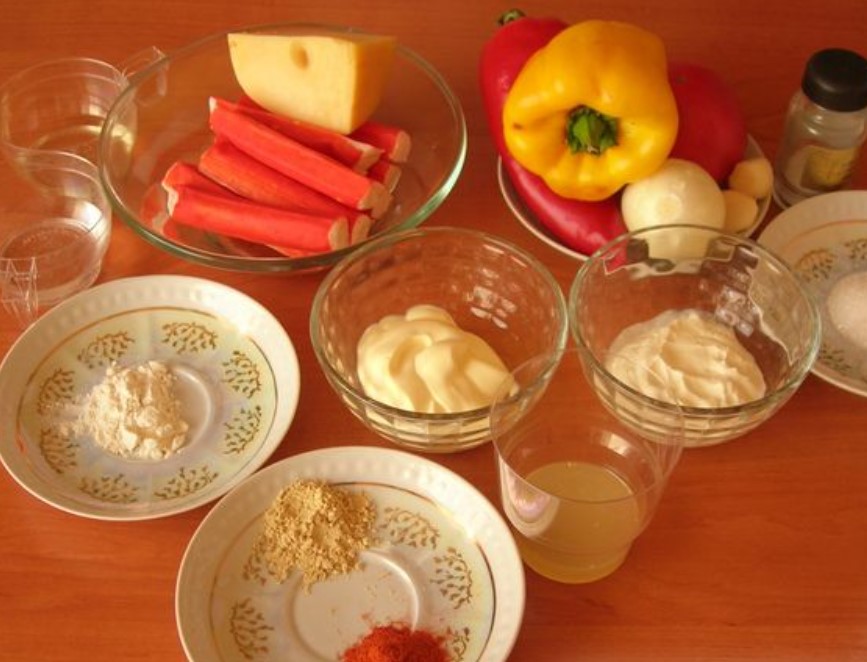 Pepper is cleaned of seeds and partitions. Cut into thin strips. We leave part of the chopped peppers (red and yellow) to decorate the salad, send the rest to the salad bowl.