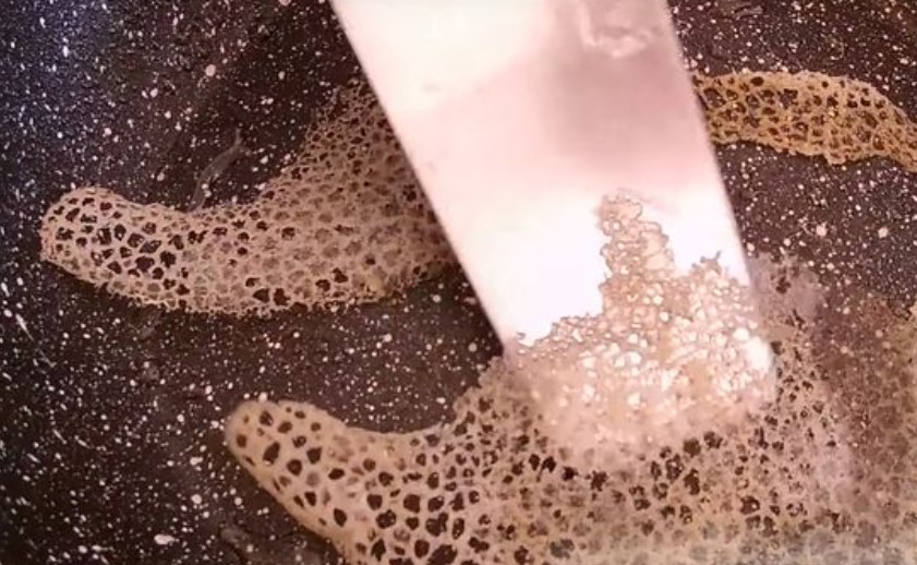 Pour the dough for chips into a hot frying pan and wait for the liquid to evaporate.