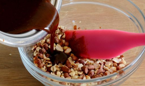 Add about a quarter of the caramel mass to the nuts and stir.