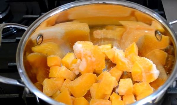 Cut the pumpkin pulp into cubes. I have a frozen, already cut pumpkin. Place the pumpkin in the pot. Cut the carrots in approximately the same way and add to the pumpkin. Add dried apricots to the pan. Fill in all with 50 ml of water.