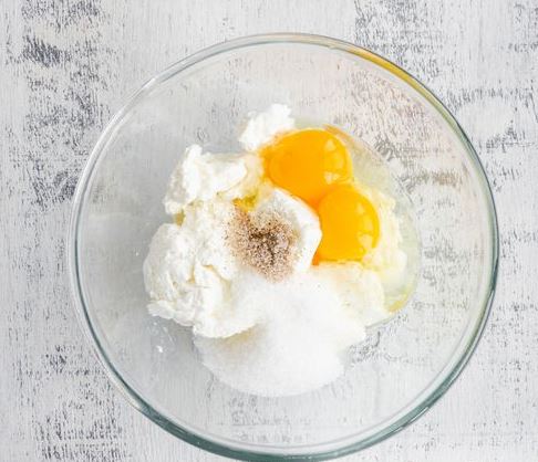 In a bowl, combine cottage cheese, eggs, sugar, and vanilla sugar. Punch with a hand blender until smooth. Add semolina.
