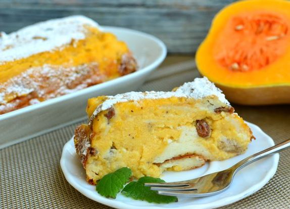 An original dish of pumpkin and cottage cheese – “marble” cottage cheese casserole with pumpkin, raisins, and cinnamon. The white and orange layers of the casserole go well with each other: the white ones are a little denser, and the orange ones look like a juicy, moist mousse. Such a bright and delicious dessert with a sunny color is a great addition to your morning cup of tea or coffee!