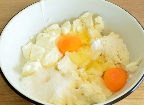 Mix thoroughly by rubbing the curd lumps with a fork. If desired, for greater homogeneity, the mass can be pierced with a hand blender.