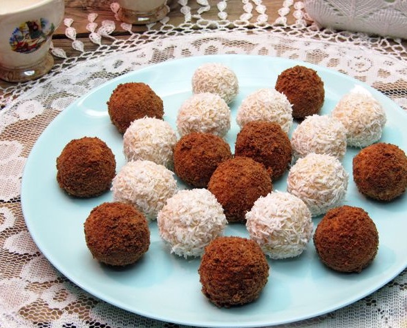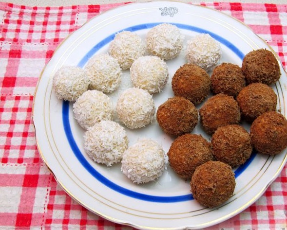 Roll half of the balls in chocolate and half in coconut. If chocolate or coconut flakes do not adhere well to the surface, you can quickly dip each ball into cold water for a second immediately before rolling.