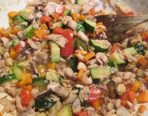 Thaw seafood and sauté. Vegetables must be peeled and cut into small cubes, added to seafood, and also fried. Add a little broth, salt and simmer for about 15-20 minutes