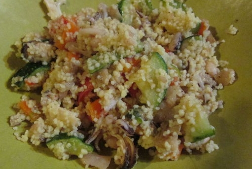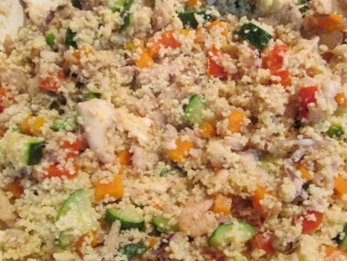 Add prepared couscous to vegetables and seafood. Mix gently.