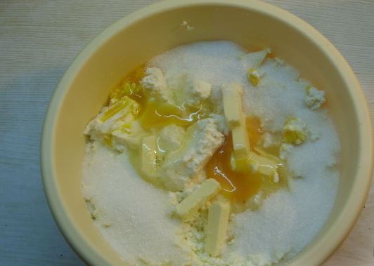 Put cottage cheese, eggs, sugar, milk, softened butter, and vanillin in a bowl. Beat everything well.