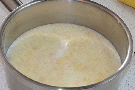 Put a saucepan with milk and gelatin over low heat and stir all the time with a spoon until the gelatin is completely dissolved. Do not boil, just warm up! While the milk is cooling, cut the bananas.