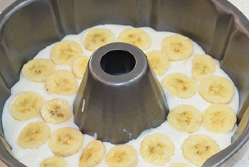 Pour some of the jelly into any baking dish, put the bananas on top, fill in the jelly. So we continue to the very top of the form – layout the bananas and fill in the jelly. The last layer is jelly.