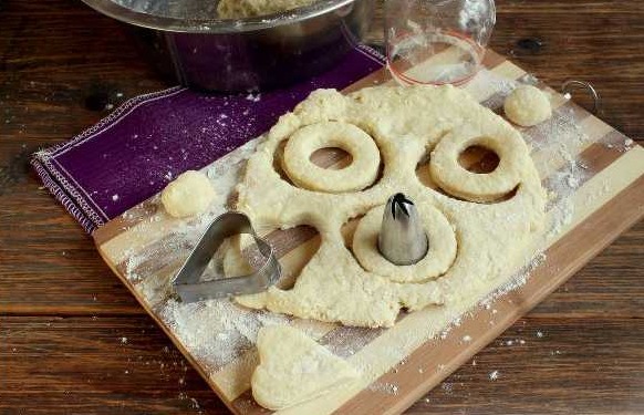 Sprinkle flour on a board and a rolling pin – roll out a layer of curd dough about 7-8 mm thick.