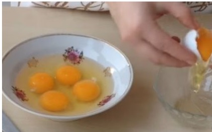 We drive four eggs into a bowl, divide the fifth egg into white and yolk. We set aside the protein in a separate bowl, and combine the yolk with the rest of the eggs.