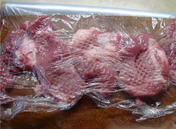 Meat is best prepared in chunks. I tried entrecote – not so tasty. Beat off pieces of meat. I cover with cling film. I hit hard. Then I remove the film, pepper it, salt it and beat it lightly again.