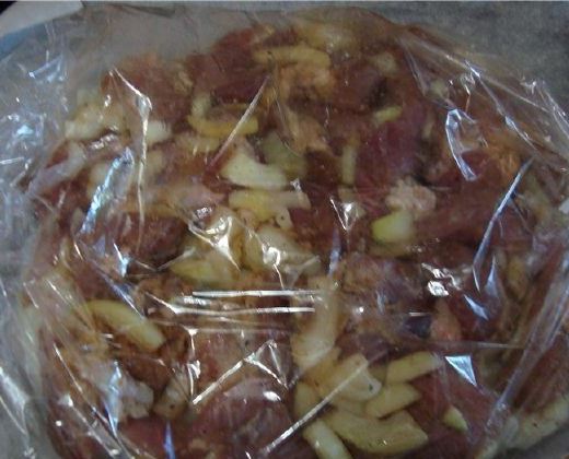 Put the meat on top of the onion. Do not mix with pickled onions. Tie the other end of the sleeve. And we make several punctures on top of the sleeve. We put in the oven and bake the kebab in the oven for about 1-1.5 hours. Depends on the oven. The meat should be lightly toasted.