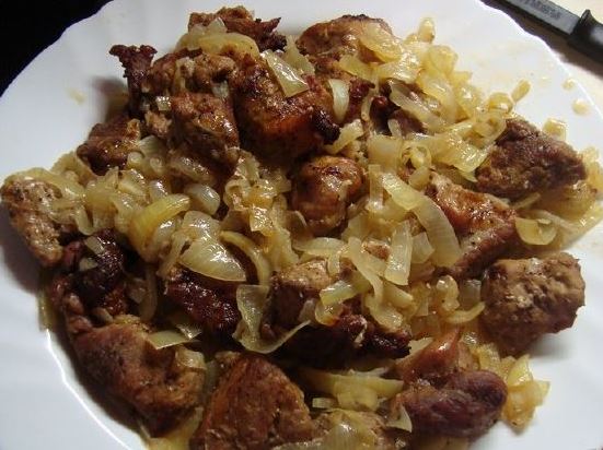 We take it out and put it on a dish. The onions are also very tasty!