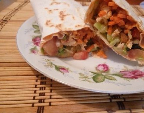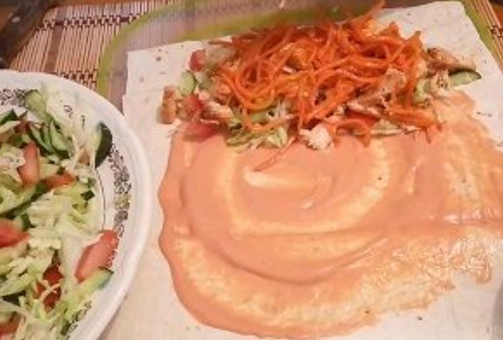 - Lavash grease with dressing put salad on the edge. Then – the meat, cover everything with Korean carrots. Let’s wrap the pita bread.