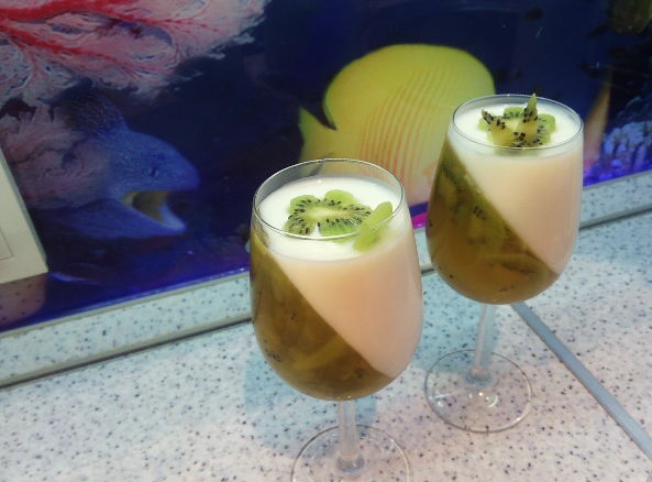 Slice the kiwi. We put glasses at an angle of 45 degrees on ice, put kiwi in them, pour half of the juice with gelatin and put in the refrigerator.