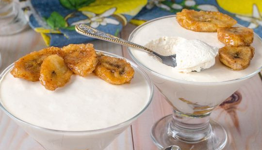Dessert of fermented baked milk and cream, with caramelized bananas – the most delicate delicacy with a bright creamy banana taste, which is easy to prepare. The result will certainly delight you. This dessert can be a great breakfast or afternoon snack.