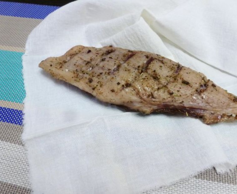After the time has elapsed, remove the meat and shake off the salt grains that have not dissolved. Hang the breast over the sink to drain the moisture and dry it slightly.