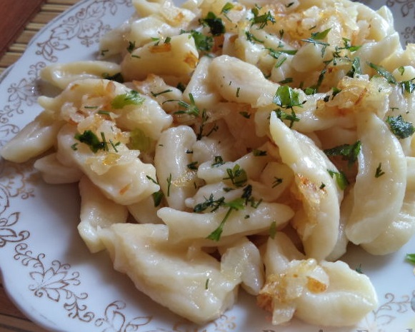 Put the ready-made dumplings in plates, pour with overcooked butter and sprinkle with fried onions.