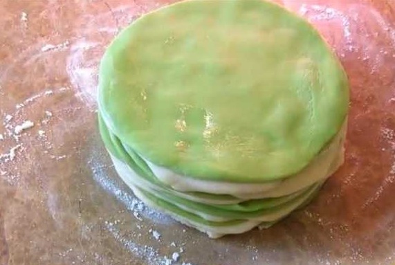 Let the green dough lie under the film for about 20 minutes, after which we divide each dough into 8 parts.