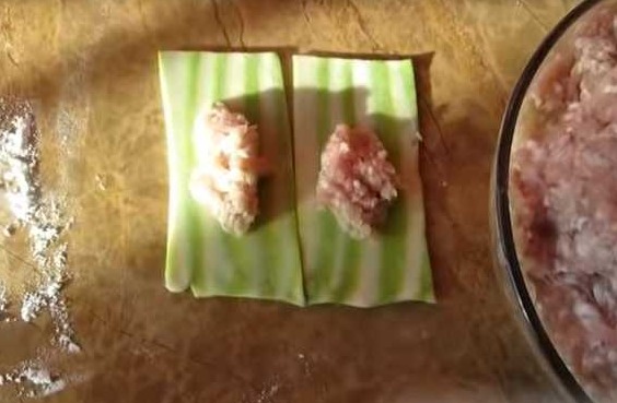 I use regular minced meat, dumplings. We spread the minced meat on the dough. The edges of the dough can be lightly moistened with water to mold them well.