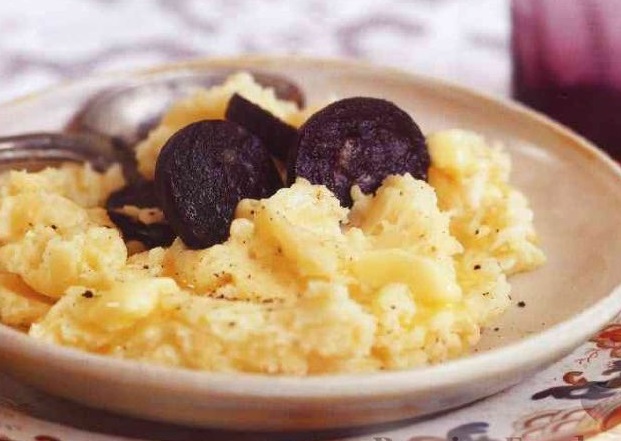 Serve mashed potatoes with grilled blood sausage and butter.