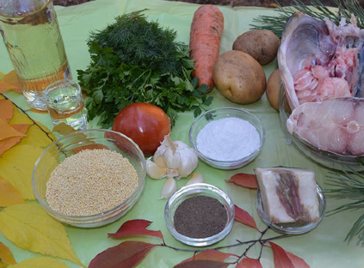 While the fish is boiling with vegetables, cut the bacon into small cubes. You don’t need to add lard to your ear, but we decided to make it a little rich. Cut the onion into small cubes. Chop the garlic with a knife. Rinse the millet. Wash greens, shake off water, chop. After ten minutes, take out the fish, also remove the onion