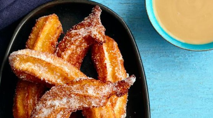 Brown the churros for about 3 minutes per batch. Bring the oil back to its original temperature between batches. Place the churros on a plate covered with a paper towel to remove the excess oil, then coat them in sugar. Serve them with coconut sauce.