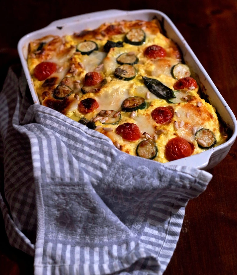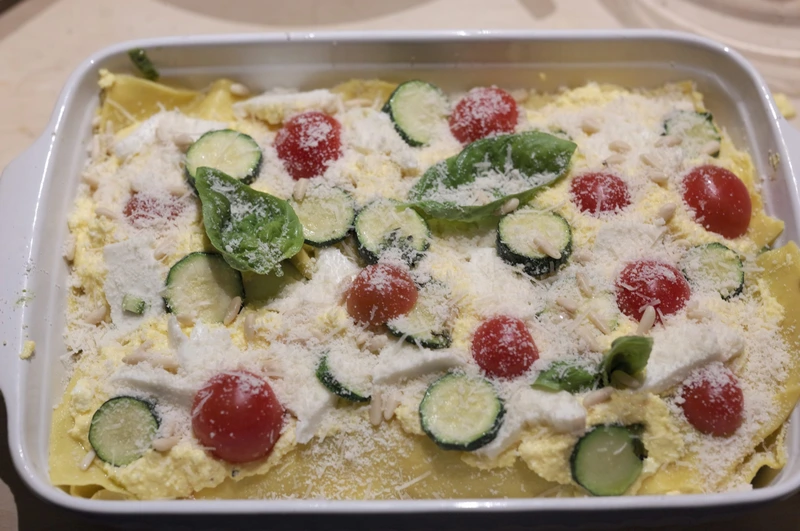 Preheat oven to 180 ° C. Grease a rectangular baking dish with olive oil, add a few teaspoons of pesto. Put the paste in one layer with a slight overlap between the sheets. If necessary, trim off excess dough. Put a few spoons of ricotta and pesto filling, a few slices of mozzarella and zucchini, add a couple of pinches of parmesan and nuts each. Cover with another layer of dough and add all the filling ingredients. Repeat still 2-3 times, the last should be the filling layer. Top with cherry tomatoes, basil leaves and generously sprinkle with Parmesan.