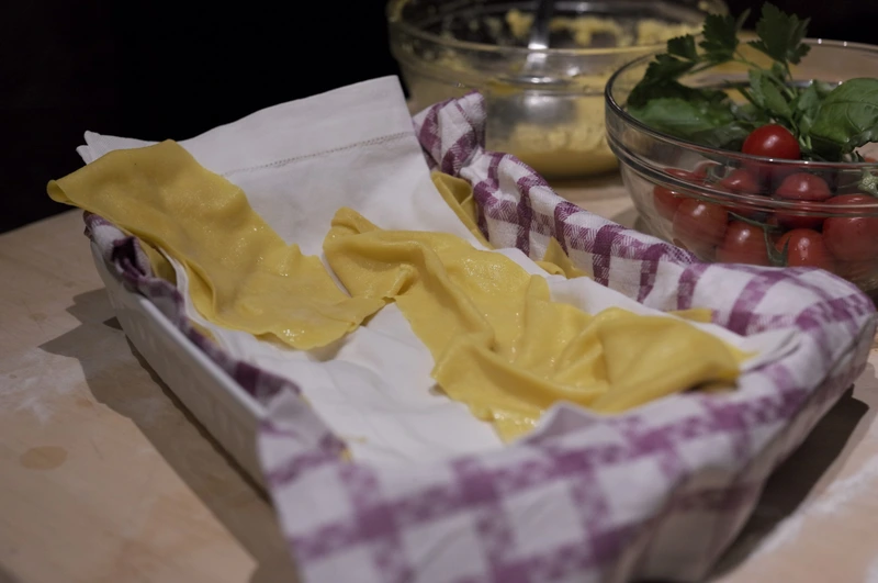 The first step is the dough. Knead it, let it rest, and roll it into strips 15 cm wide and 1 mm thick. In a large amount of salted boiling water, cook the pasta 3-4 sheets each, gently stirring, for 1 minute. Transfer gently to a bowl of cold water and 2-3 tbsp olive oil. Allow cooling completely. Put on a towel and pat dry.