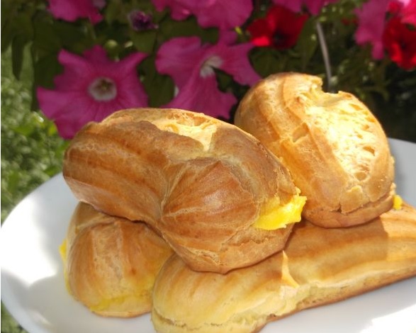The cakes are filled with cream using a pastry syringe. Ready-made Eclair cakes with custard are served with coffee or tea.