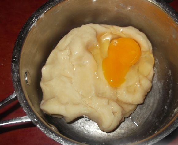 One by one, 4-5 eggs are gradually introduced, each time stirring the dough until smooth.