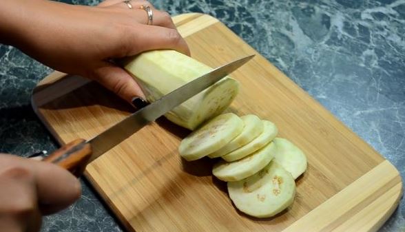Cut the eggplants into slices 0.5 cm thick. Then pour over the eggplants with salted water and leave for 20 minutes. Fry the squeezed eggplants in oil on both sides. Put them on a napkin.