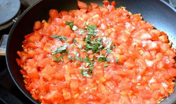 The tomatoes must be blanched. Then chop finely. Finely chop the garlic. Chop hot peppers into small pieces. Grind the basil. Fry the garlic and pepper in oil for 30 seconds.