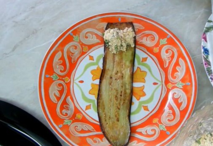 Put a little filling on a plate of eggplant and roll up, forming a roll.