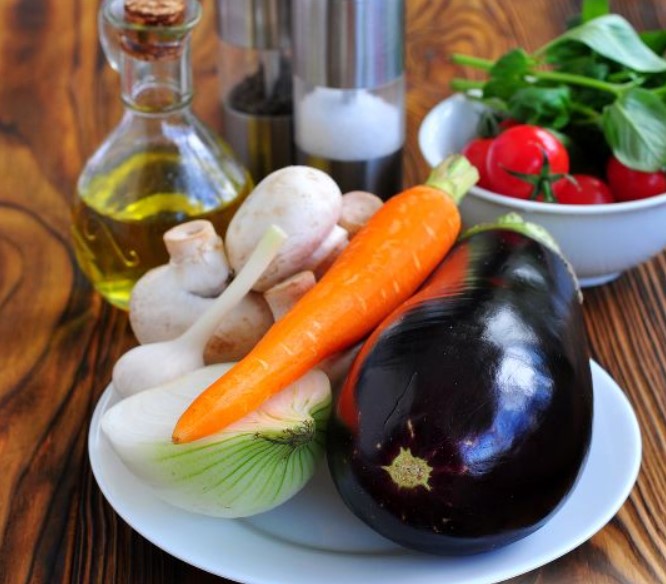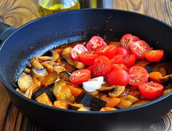 This is a versatile dish made from stewed vegetables and mushrooms. Stewed eggplants with tomatoes and mushrooms can be served hot or cold, as a separate dish or as a side dish.